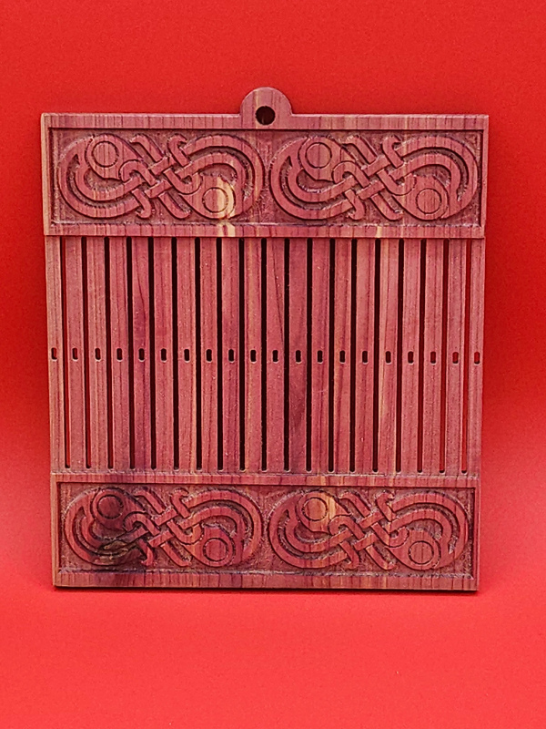 This striking rigid heddle loom is crafted from rich, aromatic Cedar wood and adorned with intricately carved beast knotwork at both the top and bottom. The interlacing animal motifs draw inspiration from Viking Age art styles, echoing the designs found on artifacts and carvings unearthed from Norse burial sites and settlements.