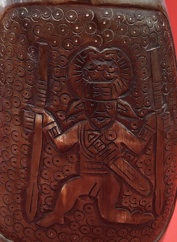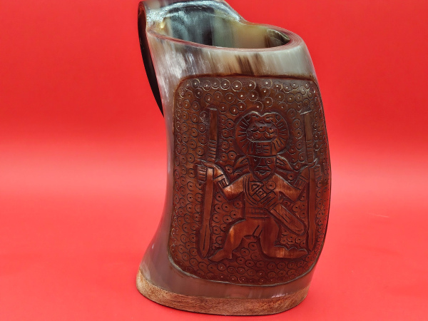 Drink like a true Norseman with this carved Viking horn tankard, handcrafted from natural horn and finished with a sturdy wooden base for stability. The body is richly decorated with intricate knotwork in the Viking art style, reminiscent of patterns found on rune stones, ship carvings, and grave goods from the Viking Age.
