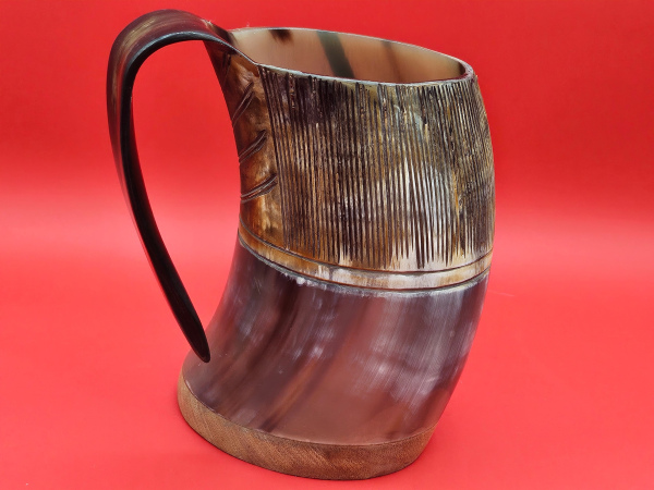 Drink like a true Norseman with this carved Viking horn tankard, handcrafted from natural horn and finished with a sturdy wooden base for stability. The body is richly decorated in the Viking art style, reminiscent of patterns found on rune stones, ship carvings, and grave goods from the Viking Age.
