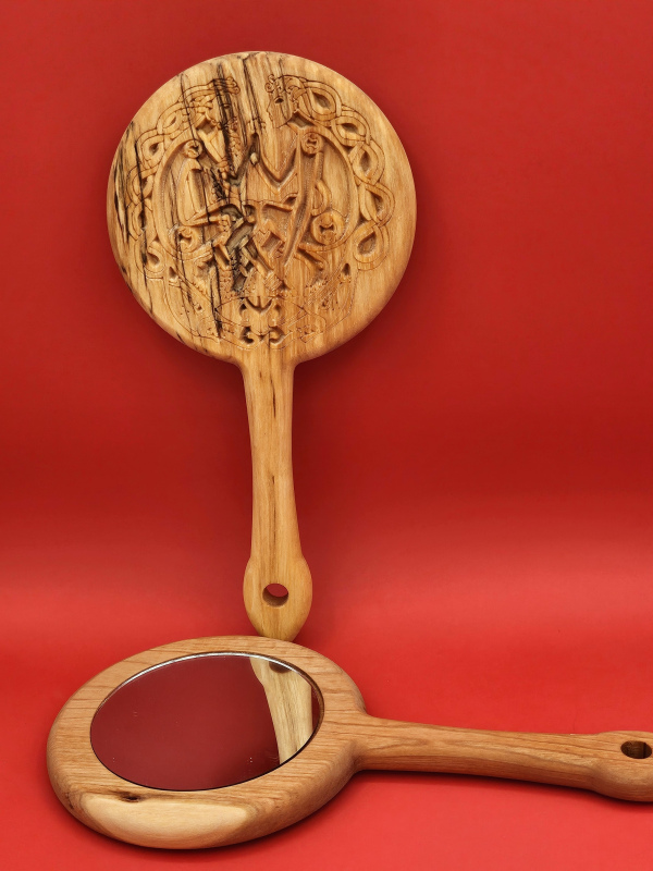 Each mirror features a distinct engraved motif, from Norse knotwork and floral patterns to celestial and folkloric symbols. The warm tones of the wood give each piece a rustic, organic charm. These mirrors are lightweight yet sturdy, and fit comfortably in the hand for daily use.