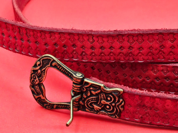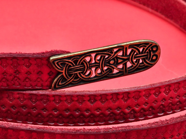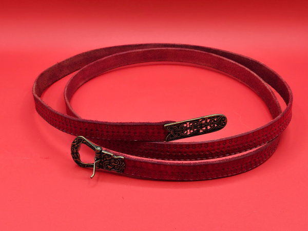 This bold and durable belt is crafted from rich red leather, hand-tooled with traditional designs that give it a timeless, historical flair. Finished with a sturdy cast metal buckle and matching end piece, it balances practicality with style.