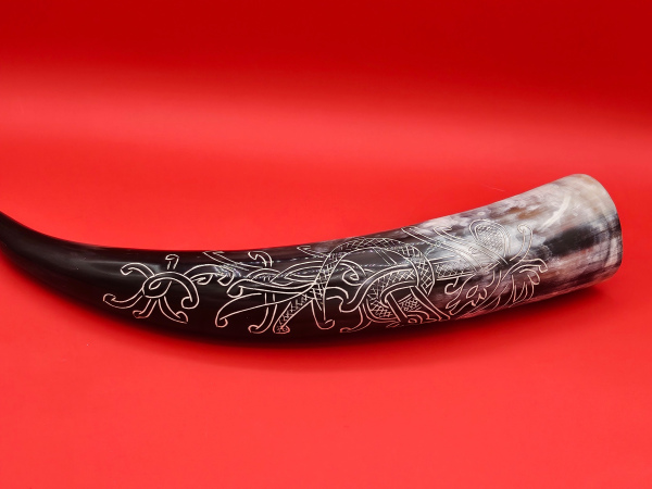 Raise your horn in true Viking fashion with this hand-carved drinking vessel, crafted from authentic cattle horn and etched with striking Norse knotwork and serpent motifs. The intertwining designs recall the art styles found on Viking Age artifacts such as the Oseberg ship carvings and the runestones of Scandinavia, where beasts and serpents symbolized power, protection, and the eternal cycle of life.