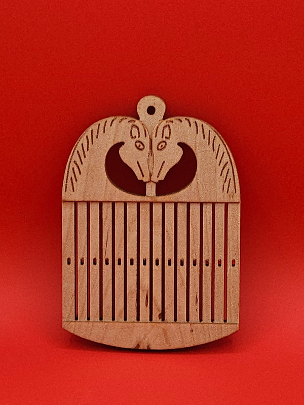 This striking rigid heddle loom is crafted from maple wood and adorned with intricately carved Horse head design at the top. The animal motifs draw inspiration from Viking Age art styles, echoing the designs found on artifacts and carvings unearthed from Norse burial sites and settlements.