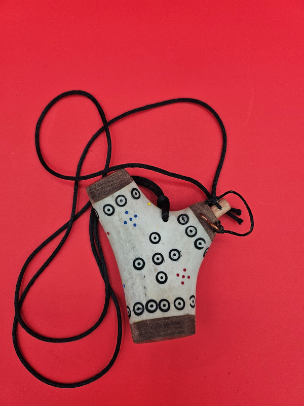 Carved from bone and capped with wood, this piece is decorated with traditional ring-and-dot motifs in striking red—an artistic design commonly seen in Norse artifacts. Its compact, wearable form makes it a perfect addition for reenactment, living history, or as a unique conversation piece.
