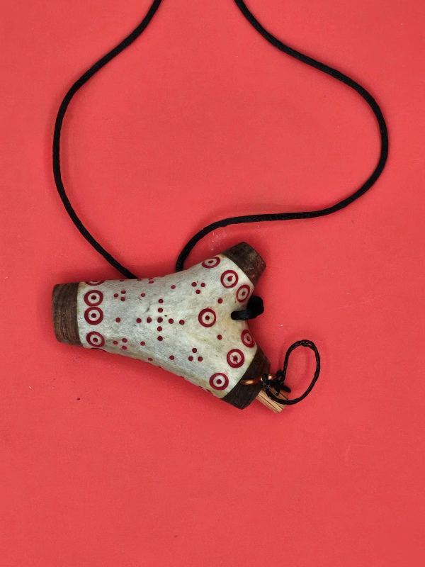 Carved from bone and capped with wood, this piece is decorated with traditional ring-and-dot motifs in striking red—an artistic design commonly seen in Norse artifacts. Its compact, wearable form makes it a perfect addition for reenactment, living history, or as a unique conversation piece.